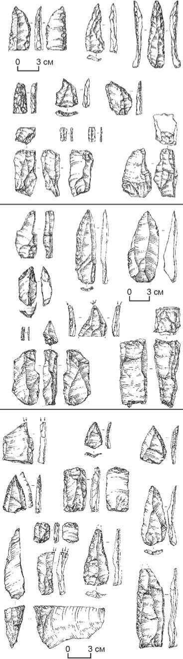 дователи, является отражением развития традиций, на которых основана индустрия нижележащего слоя. Они, несомненно, связаны и хронологически: судя по осадконакоплению, их разделяет сравнительно небольшой временной интервал. В коллекции слоя 23 рельефнее отражены объемное расщепление и ориентация на получение пластинчатых заготовок крупных размеров, тогда как в индустрии слоя 24 более широко представлены торцовое расщепление и кареноидные изделия, хотя в слое 23 исследователи выделили значительное количество пластинок и микропластинок.