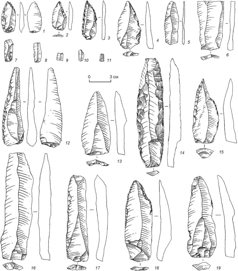 1–4 , 6 , 7 , 9 , 10 – пластины и пластинки; 5 , 8 , 11–14 , 19 – пластины и пластинки с ретушью; 15, 18 – остроконечники с ретушью; 16 , 17 – скребла.