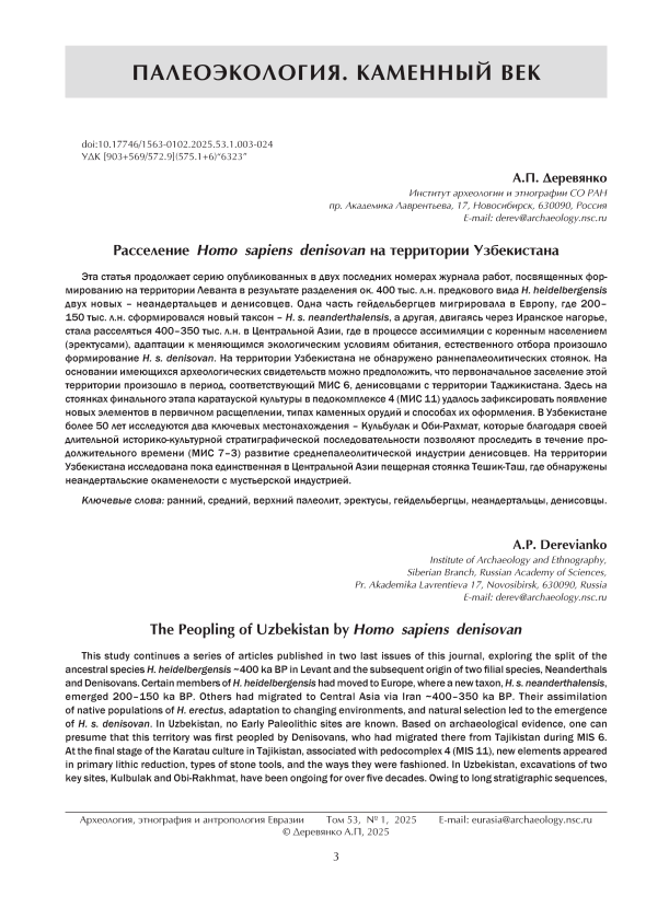 Эта статья продолжает серию опубликованных в двух последних номерах журнала работ, посвященных формированию на территории Леванта в результате разделения ок. 400 тыс. л.н. предкового вида H. heidelbergensis двух новых – неандертальцев и денисовцев. Одна часть гейдельбергцев мигрировала в Европу, где 200– 150 тыс. л.н. сформировался новый таксон – H. s. neanderthalensis, а другая, двигаясь через Иранское нагорье, стала расселяться 400–350 тыс. л.н. в Центральной Азии, где в процессе ассимиляции с коренным населением (эректусами), адаптации к меняющимся экологическим условиям обитания, естественного отбора произошло формирование H. s. denisovan. На территории Узбекистана не обнаружено раннепалеолитических стоянок. На основании имеющихся археологических свидетельств можно предположить, что первоначальное заселение этой территории произошло в период, соответствующий МИС 6, денисовцами с территории Таджикистана. Здесь на стоянках финального этапа каратауской культуры в педокомплексе 4 (МИС 11) удалось зафиксировать появление новых элементов в первичном расщеплении, типах каменных орудий и способах их оформления. В Узбекистане более 50 лет исследуются два ключевых местонахождения – Кульбулак и Оби-Рахмат, которые благодаря своей длительной историко-культурной стратиграфической последовательности позволяют проследить в течение продолжительного времени (МИС 7–3) развитие среднепалеолитической индустрии денисовцев. На территории Узбекистана исследована пока единственная в Центральной Азии пещерная стоянка Тешик-Таш, где обнаружены неандертальские окаменелости с мустьерской индустрией.