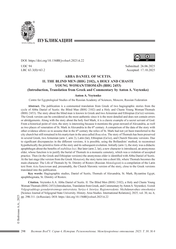 Публикация представляет собой комментированный перевод с греческого двух агиографических рассказов из цикла аввы Даниила Скитского: О слепце (BHG 2102) и о Фомаиде (BHG 2453). Рассказ о слепце известен в греческой, двух армянских и эфиопской (геэз) версиях. Наиболее аутентичной можно считать греческую версию, поскольку она самая подробная, не содержит ошибок и сокращений. Наряду с рассказом о юродивом Марке, он представляет собой классический пример тайного слуги Божиего. С исторической точки зрения рассказ интересен упоминанием о «великом экономе», а также о двух местах почитания св. Марка в Александрии VI века. Сопоставление данных рассказа с другими свидетельствами позволяет сделать предположение, что в VI в. мощи св. Марка еще не были перенесены в городскую церковь, а оставались в его мартирии в районе, именуемом Букол. Рассказ о Фомаиде сохранился в нескольких греческих, двух армянских (arm 1, arm 2), латинской (lat), эфиопской (геэз) и церковнославянских версиях. Благодаря значительным расхождениям в разных версиях, можно, пользуясь методом болландистов, гипотетически реконструировать начальную форму рассказа и его последующую эволюцию. Изначально (arm 1) рассказ представлял собой дидактическую апофтегму о пользе stabilitas loci. Но впоследствии (arm 2, lat) туда вводится новый персонаж, анонимный старец, функция которого – обосновать захоронение Фомаиды на монашеском кладбище, что являлось нарушением принятой практики. Затем (греческие и эфиопская версии) анонимный старец отождествляется с аввой Даниилом. На последнем этапе (версия из греческой Минеи) рассказ превращается в краткое житие, где Фомаида становится главным героем. Житие Фомаиды, составленное свт. Димитрием Ростовским, представляет собой компиляцию латинского текста из Acta Sanctorum и, предположительно, церковнославянской версии рассказа, близкого к переведенным в публикации греческим версиям.