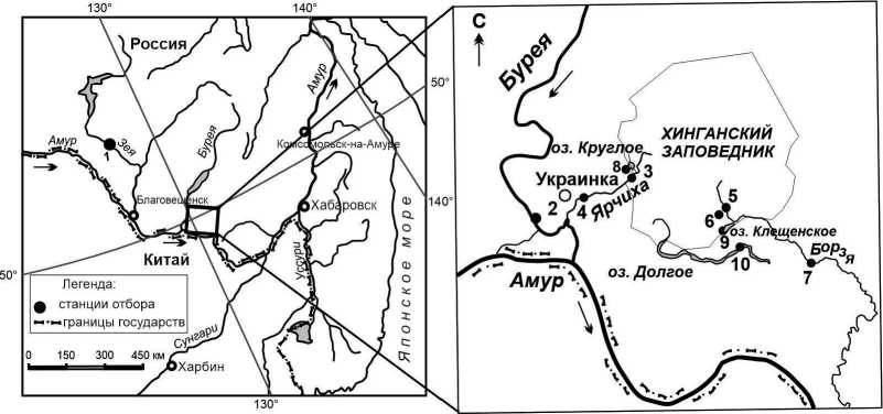 Работа проводилась в 2012–2018 гг. в бассейне Среднего Амура, станции отбора проб представлены на рис.