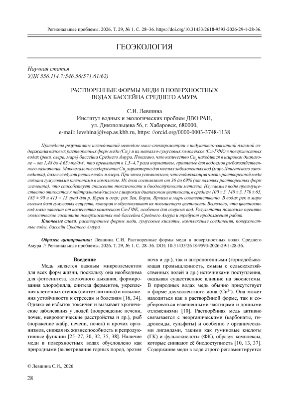 Приведены результаты исследований методом масс-спектрометрии с индуктивно-связанной плазмой содержания валовых растворенных форм меди (Cuр) и их металло-гумусовых комплексов (Cu-ГФК) в поверхностных водах (реки, озера, марь) бассейна Среднего Амура. Показано, что количество Cuр находится в широком диапазоне – от 1,48 до 4,65 мкг/дм3, что превышает в 1,5–4,7 раза нормативы, принятые для водоемов рыбохозяйственного назначения. Максимальное содержание Cuр характерно для кислых заболоченных вод (марь Хинганского заповедника), далее следуют речные воды и озера. При этом установлено, что подавляющая часть растворенной меди связана гумусовыми кислотами в комплексы. Их доля составляет от 36 до 69% (от валовых растворенных форм элемента), что способствует снижению токсичности и биодоступности металла.. Изучаемые воды преимущественно относятся к нейтральным/кислым с широким диапазоном цветности, в среднем 100 ± 3, 140 ± 3, 170 ± 65, 185 ± 90 и 415 ± 15 град для р. Бурея и озер; рек Зея, Борзя, Ярчиха и марь соответственно. В водах рек и мари высока доля гумусовых веществ, которая и обусловливает их повышенную цветность. Выявлено, что цветность вод мало зависит от количества комплексов Cu-ГФК, особенно для озерных вод. Результаты позволили оценить экологическое состояние поверхностных вод бассейна Среднего Амура и требуют продолжения работ.