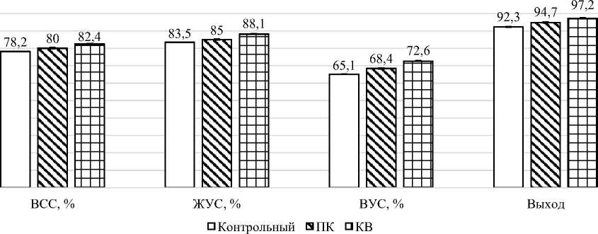 ВСС и ЖУС напрямую связано с увеличением выхода готового продукта. Наибольший выход (97,2 %) наблюдался у образца с кукурузными волокнами, что объясняется минимальными потерями влаги и жира при термической обработке благодаря его свойствам, что подтверждает гипотезы [12, 10], что применение ПВ является эффективным технологическим приёмом для снижения экономических потерь.