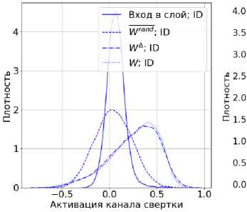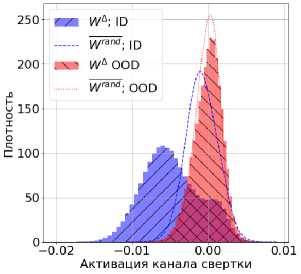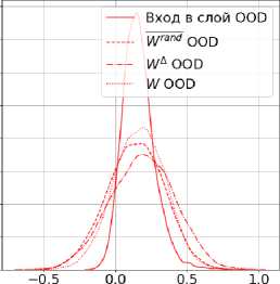 Помимо изменения взаимных распределений, поведение Wrand и W Л отличается на уровне активаций нейронов. На рис. Зв представлено распределение одного из каналов свертки. Выбран презентабельный канал. Распределение взаимодействия с Wrand OOD-данных незначительно отличается от распределения взаимодействия с WЛ. Значит OOD-данные взаимодействуют с данными направлениями одинаково, то есть на уровне корреляции со случайными направлениями.