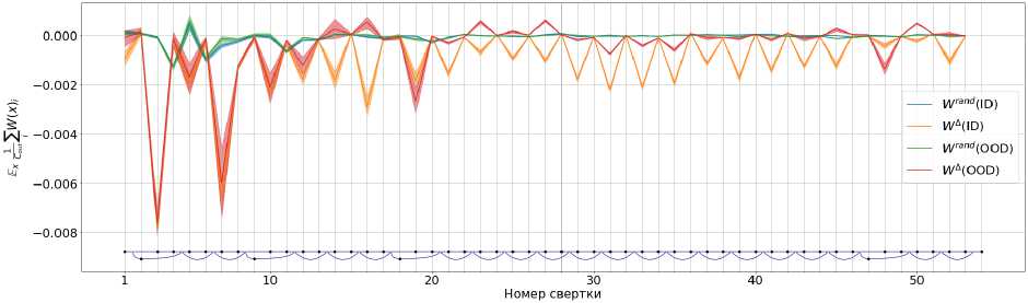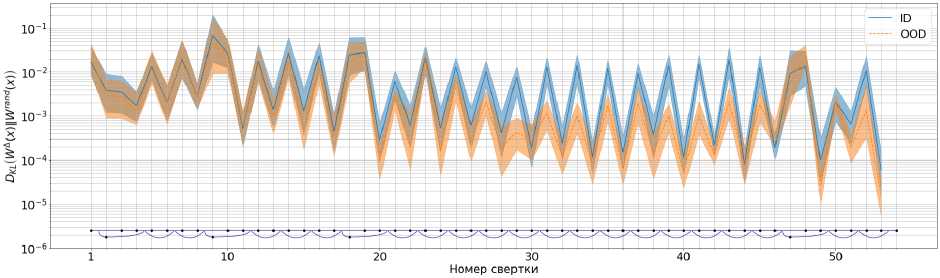 На рис. 4 представлен график близости распределений взаимодействия данных с WЛ и W rand для каждой свертки вдоль всей модели. В качестве меры близости используется симметричная дивергенция Кульбака-Лейблера. Данный график подтверждает наше утверждение, что OOD взаимодействует с W значительно хуже, чем ID.