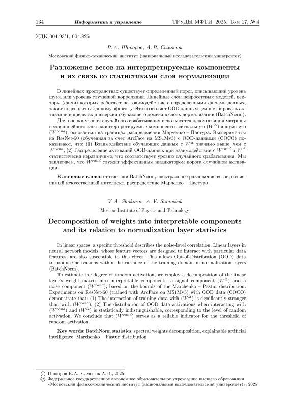 В линейных пространствах существует определенный порог, описывающий уровень шума или уровень случайной корреляции. Линейные слои нейросетевых моделей, векторы (фичи) которых работают на взаимодействие с определенными фичами данных, также подвержены данному эффекту. Это позволяет OOD данным демонстрировать активации в пределах дисперсии обучающего домена в слоях нормализации (BatchNorm). Для оценки уровня случайного срабатывания используется декомпозиция матрицы весов линейного слоя на интерпретируемые компоненты: сигнальную (𝑊Δ) и шумовую (𝑊𝑟𝑎𝑛𝑑), основанная на границах распределении Марченко – Пастура. Эксперименты на ResNet-50 (обученная за счет ArcFace на MS1Mv3) с OOD-данными (COCO) показывают, что: (1) Взаимодействие обучающих данных с 𝑊Δ значимо выше, чем с 𝑊𝑟𝑎𝑛𝑑; (2) Распределение активаций OOD-данных при взаимодействии с 𝑊𝑟𝑎𝑛𝑑 и 𝑊Δ статистически неразличимо, что соответствует уровню случайного срабатывания. Мы заключаем, что 𝑊𝑟𝑎𝑛𝑑 служит эффективным индикатором порога случайной активации.