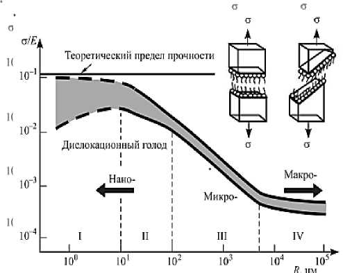 На рисунке 1 представлена зависимость характеристик прочности твердых тел при вдавливании индентора от определяющих размеров объекта R – глубины отпечатка в данном случае [16 - 19]. Здесь о теоретический предел прочности идеальной кристаллической решетки; Е - модуль Юнга; R - диагональ или глубина отпечатка.