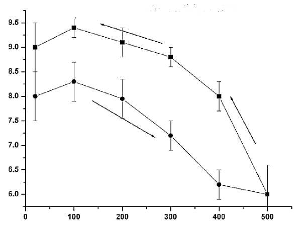 При измерении микротвердости при комнатной температуре на микротвердомере ИТВ-1-АМ получено значение микротвердости 612 HV при нагрузке 0,1 кгс и глубине отпечатка 3520 нм. Для сравнения микротвердости 612 HV (кгс/мм2) с результатами измерения нанотвердости при 20 ° С (см. рис. 2) был произведен пересчет этого значения в ГПа умножением на коэффициент 0,00980665 и получено значение 6,0 ГПа. Это значение микротвердости значительно ниже нанотвердости 9 ГПа при одинаковых комнатных температурах, что подтверждает вышеуказанный размерный эффект при переходе от нанотвердости к микротвердости.
