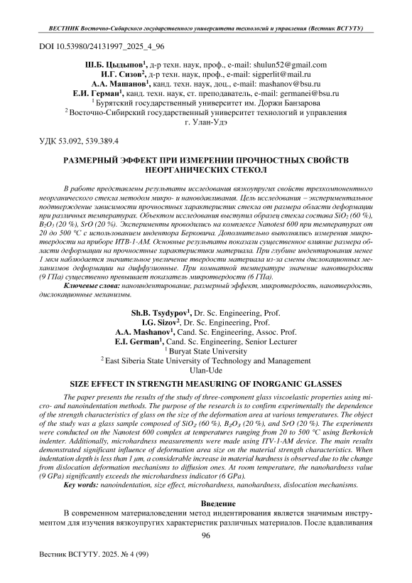 В работе представлены результаты исследования вязкоупругих свойств трехкомпонентного неорганического стекла методом микрои нановдавливания. Цель исследования экспериментальное подтверждение зависимости прочностных характеристик стекла от размера области деформации при различных температурах. Объектом исследования выступил образец стекла состава SiO2 (60 %), B2O3 (20 %), SrO (20 %). Эксперименты проводились на комплексе Nanotest 600 при температурах от 20 до 500 °C с использованием индентора Берковича. Дополнительно выполнялись измерения микротвердости на приборе ИТВ-1-АМ. Основные результаты показали существенное влияние размера области деформации на прочностные характеристики материала. При глубине индентирования менее 1 мкм наблюдается значительное увеличение твердости материала из-за смены дислокационных механизмов деформации на диффузионные. При комнатной температуре значение нанотвердости (9 ГПа) существенно превышает показатель микротвердости (6 ГПа).