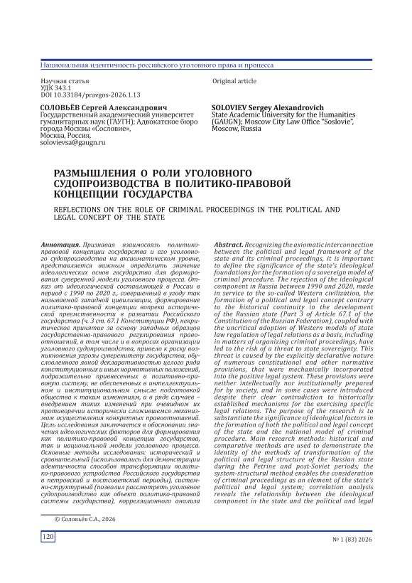 Recognizing the axiomatic interconnection between the political and legal framework of the state and its criminal proceedings, it is important to define the significance of the state’s ideological foundations for the formation of a sovereign model of criminal procedure. The rejection of the ideological component in Russia between 1990 and 2020, made in service to the so-called Western civilization, the formation of a political and legal concept contrary to the historical continuity in the development of the Russian state (Part 3 of Article 67.1 of the Constitution of the Russian Federation), coupled with the uncritical adoption of Western models of state law regulation of legal relations as a basis, including in matters of organizing criminal proceedings, have led to the risk of a threat to state sovereignty. This threat is caused by the explicitly declarative nature of numerous constitutional and other normative provisions, that were mechanically incorporated into the positive legal system. These provisions were neither intellectually nor institutionally prepared for by society, and in some cases were introduced despite their clear contradiction to historically established mechanisms for the exercising specific legal relations. The purpose of the research is to substantiate the significance of ideological factors in the formation of both the political and legal concept of the state and the national model of criminal procedure. Main research methods: historical and comparative methods are used to demonstrate the identity of the methods of transformation of the political and legal structure of the Russian state during the Petrine and post-Soviet periods; the system-structural method enables the consideration of criminal proceedings as an element of the state’s political and legal system; correlation analysis reveals the relationship between the ideological component in the state and the political and legal structure, including models of criminal procedure; the legal-dogmatic method and the interpretation of legal norms are used in the analysis of the Constitution of the Russian Federation, as well as the criminal procedural legislation of the Soviet and post-Soviet periods; the logical method allows for formulating the conclusions based on the research results. Results: The article concludes that it is necessary to bring criminal procedure legislation into line with the political and legal concept of the state transformed in 2020 (including through the constitutional entrenchment of ideological foundations). This cannot be achieved by introducing individual amendments to the Criminal Procedure Code of the Russian Federation, but rather requires the development and adoption of a new Criminal Procedure Code.