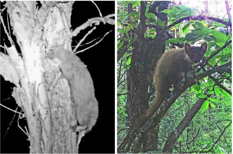 Рис. 1. Лесная куница Martes martes разоряет гнёзда зяблика Fringilla coelebs: слева – съедает кладку, 7.05.2025; справа – у гнезда с птенцами, 21.05.2025