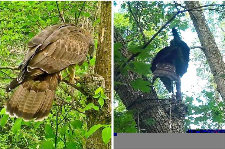 Рис. 2. Осоед Pernis apivorus разоряет гнёзда зяблика Fringilla coelebs: слева – у гнезда с кладкой, 14.05.2024; справа – съедает птенцов, 1.06.2025