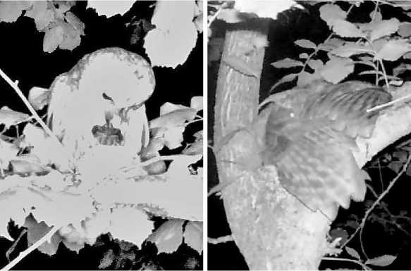 Рис. 3. Серая неясыть Strix aluco разоряет гнёзда зяблика Fringilla coelebs: слева – держит в клюве птенца, 19.05.2024; справа – хватает кладку, 22.05.2024