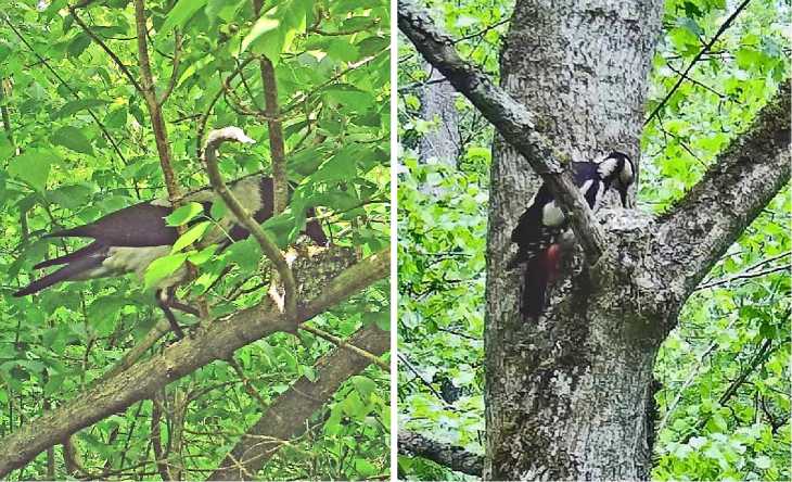 Рис. 4. Серая ворона Corvus cornix (9.05.2024) и большой пёстрый дятел Dendrocopos major (18.05.2025) разоряют гнёзда зяблика Fringilla coelebs
