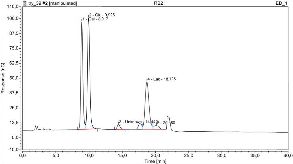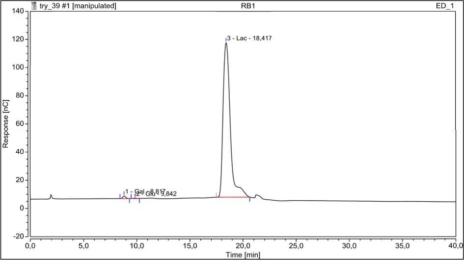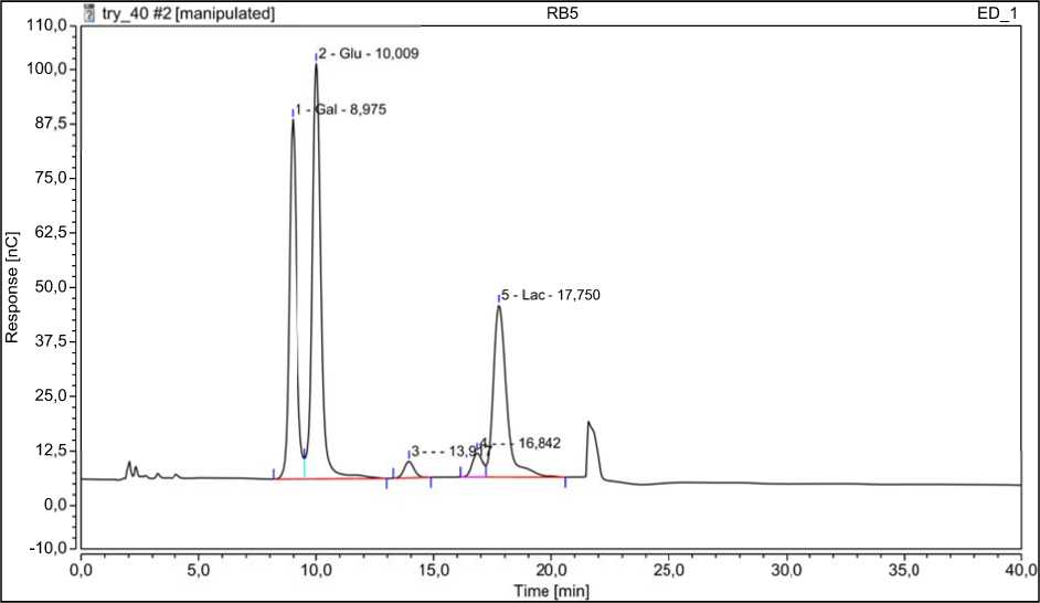 Представленная хроматограмма свидетельствует о том, что основным углеводом пермеата ПС является лактоза, профиль которой представлен в виде одного пика (99,15 %), а глюкоза и галактоза присутствуют в следовых количествах.