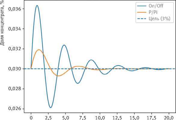 В целях сравнения алгоритмов дозирования (on/off vs P/PI) проработан экспериментальный сценарий: ступенчатое возмущение суммарного расхода 0,5 ^ 1,5 л/мин при целевой доле концентрата 3%. Показатели рассчитаны по времен-нь1 м рядам доли концентрата (табл. 7).