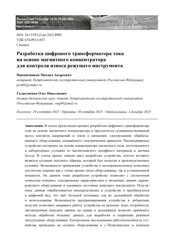 В статье представлен процесс разработки цифрового трансформатора тока на основе магнитного концентратора и предлагается усовершенствованный метод контроля напряжений и токов в питающих электролиниях обрабатывающего оборудования, оснащённого электрическим приводом. Рассматриваемое устройство построено на основе концентратора магнитного поля, изготовленного в лабораторных условиях из магнитомягкого аморфного материала и датчика Холла. В статье кратко описан цикл разработки устройства, итогом которого является создание опытного образца, который был испытан в производственных условиях. Возможности применения устройства в лесопромышленном комплексе достаточно широки как с точки зрения типов оборудования, так и установленной мощности. На данном этапе разработки устройство позволяет с достаточной точностью измерять электрические характеристики в питающих линиях дерево-режущего оборудования и оценивать состояние режущего инструмента. Получаемые данные обрабатываются непосредственно в устройстве и преобразуются в цифровой вид, что даёт большой потенциал для их дальнейшей обработки и использования. Возможности программирования устройства и добавление модулей позволяют направить работу устройства на решение задач потребителя, дистанционная передача данных на сервер в дальнейшем позволит применить методы обработки больших данных для выработки и коррекции режимов эксплуатации оборудования. Контрольные исследования работоспособности устройства проведены на сетевом оборудовании в г. Петрозаводске и показали высокую чувствительность к колебаниям нагрузки на электроприводе. Длительные испытания разработки будут проведены на ленточнопильной установке лесопильного предприятия с целью установления возможности заблаговременного выявления предельного износа зубьев пильных лент. Применение устройства позволит автоматизировать оборудование на небольших предприятиях и использовать его на маломощном оборудовании.