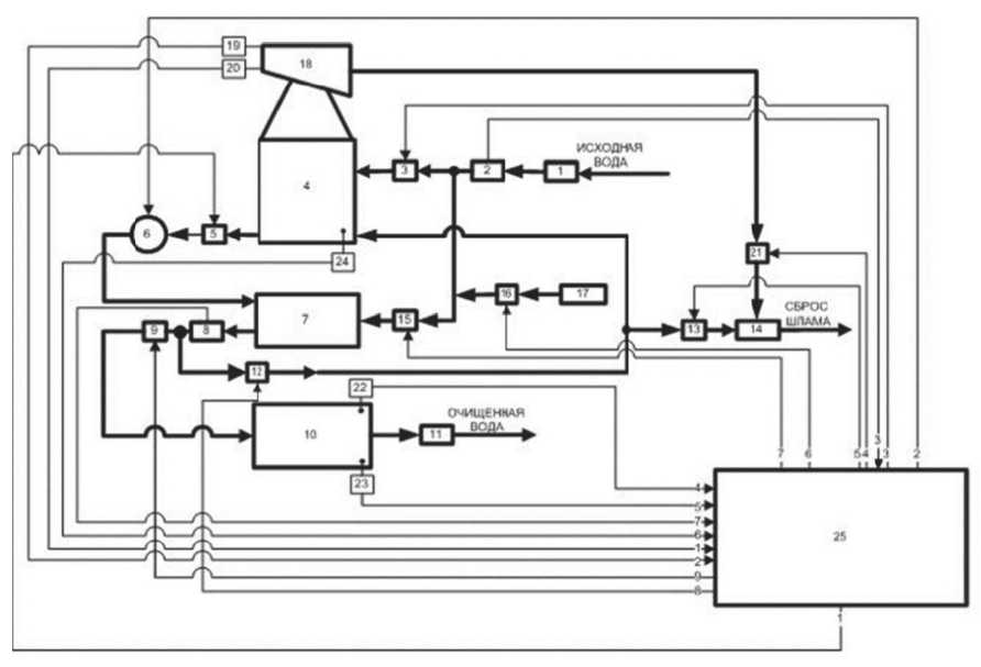 1 – первый кран ручной; 2 – первый измеритель мутности (ИМ1); 3 - клапан входа (К1); 4 – реактор; 5 – первый клапан выхода (К3); 6 – насос (Н); 7 - фильтр тонкой очистки; 8 – второй измеритель мутности (ИМ2); 9 – второй клапан выхода (К4); 10 - дополнительная ёмкость; 11 – второй кран ручной наружный; 12 – первый клапан сброса (К6); 13 - клапан слива промывочной воды (К8); 14 – накопитель; 15 – клапан промывки фильтра (К5); 16 - клапан впуска сжатого воздуха (К7); 17 – баллон сжатого воздуха; 18 – шламосборник; 19 - датчик верхнего уровня в шламосборнике (ДВУШ); 20 - датчик нижнего уровня в шламосборнике (ДНУШ); 21 – второй клапан сброса (К2); 22 - датчик верхнего уровня дополнительной емкости (ДВУБ); 23 - датчик нижнего уровня воды в дополнительной ёмкости (ДНУБ); 24 - датчик уровня воды в реакторе (ДНУФ); 25 – программируемый логический контроллер