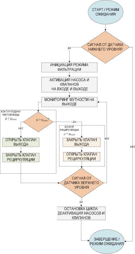 Главным режимом работы установки является алгоритм фильтрации с контролем качества, схема которого представлена на рисунке 2. Основной особенностью является ветвление логики на основе показаний выходного измерителя мутности (ИМ2).