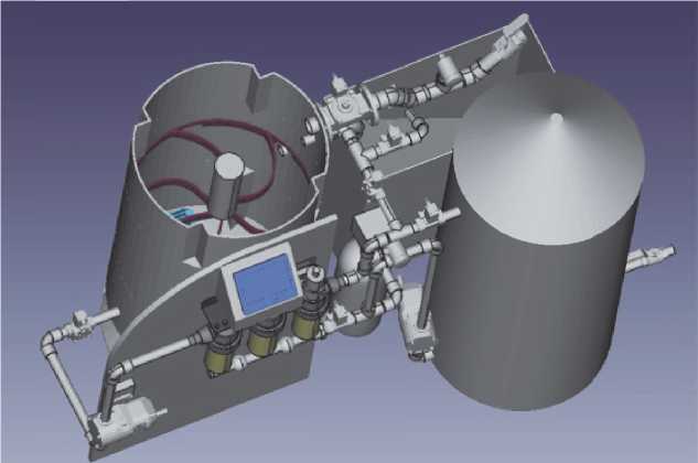 ЧМИ реализован на базе сенсорного дисплея. На основной экран выведена функциональная мнемосхема установки, где для интуитивно понятного представления о состоянии исполнительных механизмов применяется динамическая цветовая кодировка. Модель адаптивной автоматизированной установки водоочистки представлена на рисунке 3.