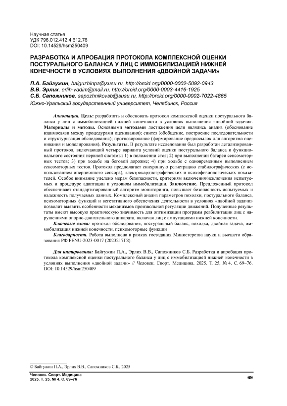 Разработка и апробация протокола комплексной оценки постурального баланса у лиц с иммобилизацией нижней конечности в условиях выполнения «двойной задачи»