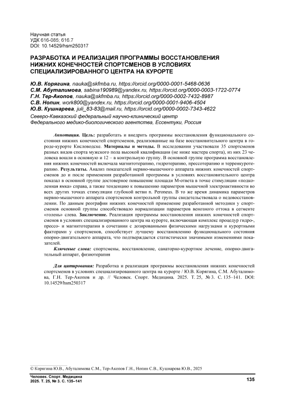 Цель: разработать и внедрить программы восстановления функционального состояния нижних конечностей спортсменов, реализованные на базе восстановительного центра в городе-курорте Кисловодске. Материалы и методы. В исследовании участвовали 35 спортсменов разных видов спорта мужского пола высокой квалификации (не ниже мастера спорта), из них 23 человека вошли в основную и 12 – в контрольную группу. В основной группе программа восстановления нижних конечностей включала магнитотерапию, гидротерапию, прессотерапию и терренкуротерапию. Результаты. Анализ показателей нервно-мышечного аппарата нижних конечностей спортсменов до и после применения разработанной программы в условиях восстановительного центра показал в основной группе достоверное повышение площади М-ответа в точке стимуляции «подколенная ямка» справа, а также тенденцию к повышению параметров мышечной электроактивности во всех других точках стимуляции глубокой ветви n. Peroneus. В то же время динамика параметров нервно-мышечного аппарата спортсменов контрольной группы свидетельствовала о недовосстановлении. По данным реографии нижних конечностей применение разработанной методики у спортсменов основной группы способствовало нормализации параметров венозного оттока в сегменте «голень» слева. Заключение. Реализация программы восстановления нижних конечностей спортсменов в условиях специализированного центра на курорте, включающая комплекс процедур гидро-, прессо- и магнитотерапии в сочетании с дозированными физическими нагрузками и курортными факторами у спортсменов, способствует лучшему восстановлению функционального состояния опорно-двигательного аппарата, что подтверждается статистически значимыми изменениями показателей.