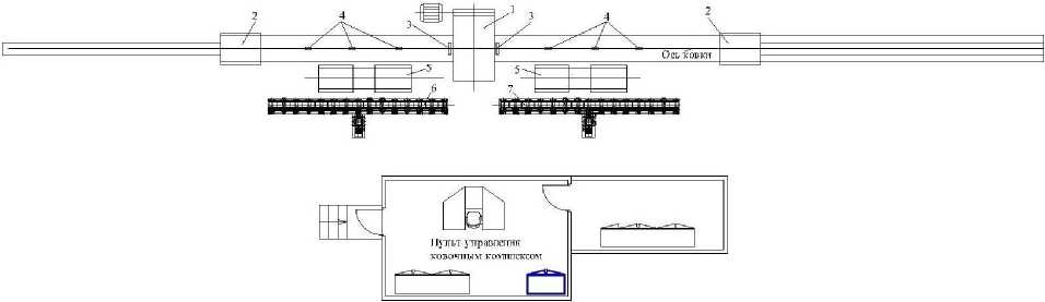 Разработан участок приема готовых профилей, включающий карманы 15 и упор-сбрасыватель 14 (см. рис. 2), позволяющий последовательно осуществлять две технологические операции: остановку перемещаемых после ковки профилей и последующую их передачу в накопительные карманы 15, не препятствуя, в случае необходимости, обратному потоку заготовок от методических печей 1, 2 к ковочному блоку. На рис. 5 приведен фрагмент участка методических печей, карманы и сбрасыватель заготовок.