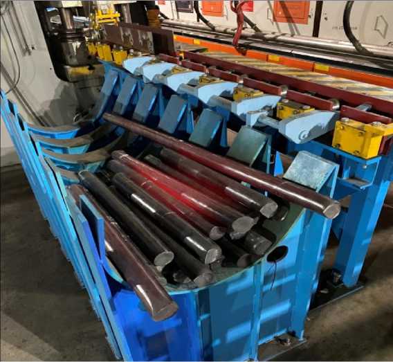 В целях обеспечения высокой производительности, качества готовой продукции и требуемых условий труда обслуживающего персонала ООО «Металлургический институт передовых технологий» совместно с ООО НПП «МЕТЧИВ» и ФГАОУ ВО «ЮжноУральский государственный университет» выполнен комплекс конструкторских разработок для оснащения радиально-ковочной машины SKK-14 средствами нагрева, транспортировки, поперечной резки и другими средствами механизации, защищенных шестью патентами на изобретения [1–6] и тремя патентами на полезную модель [7-9]. Вся конструкторская, проектная документация, а также изготовление оборудования, его монтаж и наладка выполнены силами указанных организаций.