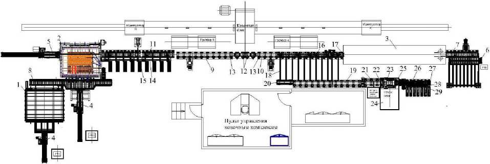 Для возможности осуществления нагрева и подогрева заготовок в различных температурных режимах в зависимости от марки стали и сплава технологическая линия радиальной ковки с машиной SKK-14 (рис. 2) дополнительно оснащена двумя разработанными методическими печами с торцевой задачей и выдачей 1 , торцевой задачей и боковой выдачей [4–6, 8], а также индукционной нагревательной установкой (УИН) 3 .