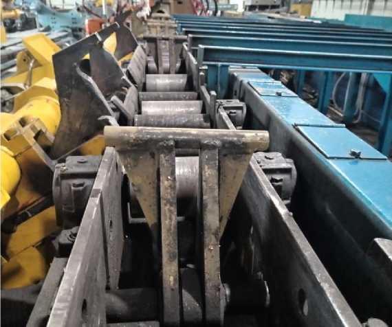 Рис. 10. Вид на приемные карманы, рычажный сбрасыватель, качающийся и приемный рольганги участка поперечной резки заготовок Fig. 10. View of the receiving pockets, lever ejector, swinging and receiving roller conveyors of the cross-cutting section of blanks