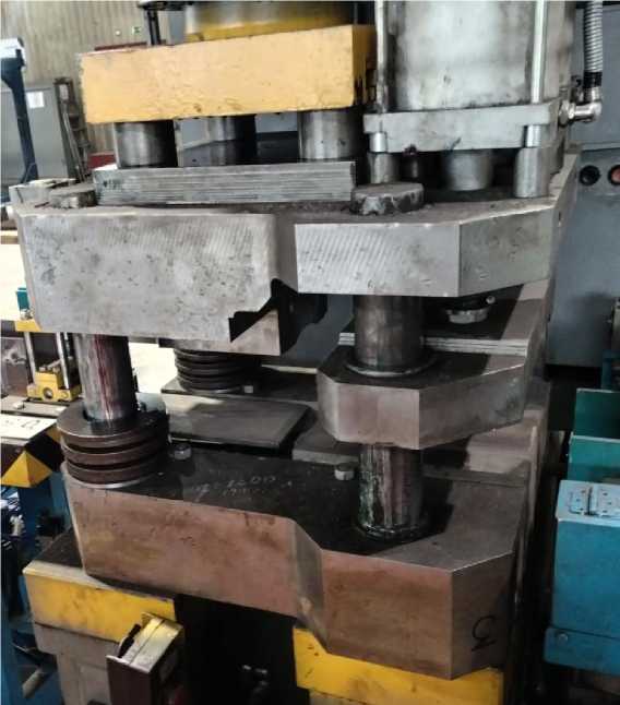 Fig. 9. View of the cross-cutting die with pneumatic clamp and spring shock absorbers, mounted on a hydraulic press with a force of 1600 kN