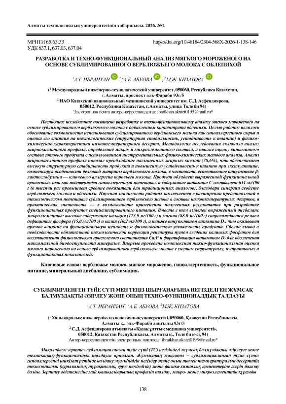 Мақаладағы зерттеу сублимацияланған түйе сүті (ТС) негізіндегі жұмсақ балмұздақты әзірлеуге және техникалық-функционалдық талдауға арналған. Жұмыстың мақсаты – сублимацияланған түйе сүтін гипоаллергенді шикізат ретінде қолдану мүмкіндігін негіздеу және оның төмен температуралық десерттің технологиялық (құрылымдық тұрақтылық, еруге төзімділік) және физика-химиялық қасиеттеріне әсерін бағалау болды. Зерттеу әдістемесіне май қышқылдарының профилін талдау, макро- және микроэлементтік құрамды анықтау, сондай-ақ дайын өнімнің витаминдік құрамын құралдық физика-химиялық әдістермен бағалау кірді. Май қышқылдарының профилін талдау барысында қаныққан май қышқылдарының үстемдігі анықталды (78,6%), бұл өнімнің жоғары құрылымдық тұрақтылығын және пайдалану кезінде еруге төзімділігін қамтамасыз етеді, сонымен қатар түйе сүтінің ақуыздық матрицасының ерекшеліктерін, атап айтқанда, сиыр сүтінің негізгі аллергені – β-лактоглобулиннің табиғи болмауын өтейді. Өнім айқын функционалдық құндылыққа ие, себебі оның гипоаллергенді потенциалы расталды, ал С витаминінің мөлшері 634 мг/100 г құрайды (дәстүрлі аналогтармен салыстырғанда мыңдаған есе жоғары), бұл түйе сүті мен теңіз дәруменінің қасиеттерінің синергиясының нәтижесі. Зерттеудің ғылыми маңыздылығы сублимациялық түйе сүтінің төмен температуралық десерттер құрамындағы технологиялық әлеуеті туралы түсінікті кеңейтуде, ал практикалық маңыздылығы – алынған нәтижелерді функционалды, арнайы тағам өнімдерін әзірлеуде қолдану мүмкіндігінде. Сонымен қатар, макроэлементтерде критикалық дисбаланс анықталды: кальцийдің жоғары мөлшері (173,9 мг/100 г) мен магнийдің (88,0 мг/100 г) болуы фосфордың (15,0 мг/100 г) және калийдің (10,2 мг/100 г) айқын жетіспеушілігімен қатар жүреді, сондай-ақ D₃ витаминінің болмауы өнімнің функционалдық құндылығына және физиологиялық сіңімділігіне тікелей әсер етеді. Осыған байланысты рецептураны міндетті түрде технологиялық түзетуді, физиологиялық тұрғыдан қолайлы Ca:P қатынасын қалпына келтіру үшін калий фосфаттарын енгізуді және минералдардың максималды биожетімділігін қамтамасыз ету үшін D₃ витаминімен фортификациялауды қажет деп санауға болады.