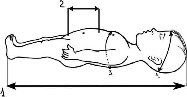 Fig. 1. Newborn at 37 weeks of gestation. Anthropometric measurements: 1 – length; 2 – xiphoid-to-pubic bone distance; 3 – chest circumference; 4 – head circumference