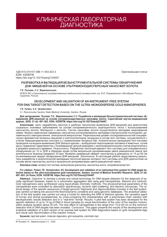 Цель: разработать простую и удобную технологию выявления ДНК-мишеней для диагностики социально значимых заболеваний н а основе колориметрического агрегационного теста с использованием наночастиц золота. Материал и методы. С интез наносфер золота осуществлялся методами жидкофазной химии. Физико-химические параметры наночастиц контролировались методами спектроскопии поглощения, динамического светорассеяния, электронной микроскопии. Рациональный дизайн последовательностей специфических фрагментов геномных мишеней и олигонуклеотидов, входящих в состав тест-системы, осуществлялся с учетом термодинамических констант и с применением геномных баз. Аналитическую валидацию тест-системы проводили на модели выявления ДНК Babesia species – возбудителя пироплазмоза человека и животных, путем кросс-сравнения характеристик с полимеразной цепной реакцией с электрофоретическим учетом результатов и в формате реального времени. Результаты. Разработан пилотный вариант тест-системы для специфического обнаружения до 10 нг ДНК в образцах крови путем визуальной дискриминации цвета реакционной смеси при длительности анализа примерно 30 мин. Выявлен размерный эффект наночастиц в диапазоне от 15 до 60 нм на минимальный предел обнаружения ДНК-мишеней. Заключение. В настоящей работе представлены результаты разработки и аналитической валидации пилотной версии экспресс-тест-системы для ДНК-диагностики на основе меток наночастиц золота и визуальной дискриминации цвета реакционной смеси.