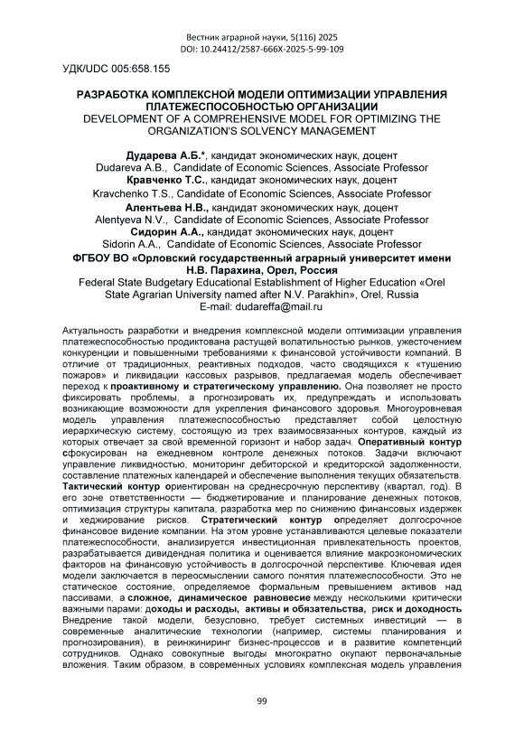 The urgency of developing and implementing a comprehensive model for optimizing solvency management is dictated by the growing volatility of markets, tougher competition and increased demands on the financial stability of companies. Unlike traditional, reactive approaches, which often boil down to "extinguishing fires" and eliminating cash gaps, the proposed model provides a transition to proactive and strategic management. It allows you not just to fix problems, but to predict them, prevent them and use the emerging opportunities to strengthen financial health. The multilevel solvency management model is an integrated hierarchical system consisting of three interconnected circuits, each of which is responsible for its own time horizon and set of tasks. The operational contour focuses on the daily control of cash flows. Tasks include managing liquidity, monitoring accounts receivable and payable, compiling payment calendars, and ensuring that current obligations are fulfilled. The tactical outline is focused on the medium term (quarter, year). His area of responsibility includes budgeting and cash flow planning, optimizing the capital structure, developing measures to reduce financial costs and hedging risks. The strategic outline defines the company's longterm financial vision. At this level, solvency targets are set, the investment attractiveness of projects is analyzed, a dividend policy is developed, and the impact of macroeconomic factors on financial stability in the long term is assessed. The key idea of the model is to rethink the very concept of solvency. This is not a static state defined by the formal excess of assets over liabilities, but a complex, dynamic balance between several critically important pairs: income and expenses, assets and liabilities, risk and profitability. Implementing such a model certainly requires systemic investments in modern analytical technologies (for example, planning and forecasting systems), and business reengineering.-processes and the development of employee competencies. However, the cumulative benefits pay off the initial investment many times over. Thus, in modern conditions, an integrated solvency management model is not a luxury, but a strategic necessity for any company seeking not just to survive, but to develop sustainably and strengthen its competitive position in the market.
