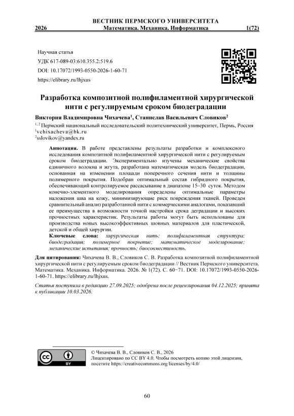 В работе представлены результаты разработки и комплексного исследования композитной полифиламентной хирургической нити с регулируемым сроком биодеградации. Экспериментально изучены механические свойства единичного волокна и жгута, разработана математическая модель биодеградации, основанная на изменении площади поперечного сечения нити и толщины полимерного покрытия. Подобран оптимальный состав гибридного покрытия, обеспечивающий контролируемое рассасывание в диапазоне 15–30 суток. Методом конечно-элементного моделирования определены оптимальные параметры наложения шва на кожу, минимизирующие риск повреждения тканей. Проведен сравнительный анализ разработанной нити с коммерческими аналогами, показавший ее преимущества в возможности точной настройки срока деградации и высоких прочностных характеристик. Результаты работы могут быть использованы для производства новых высокоэффективных шовных материалов для пластической, детской и общей хирургии.