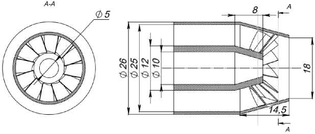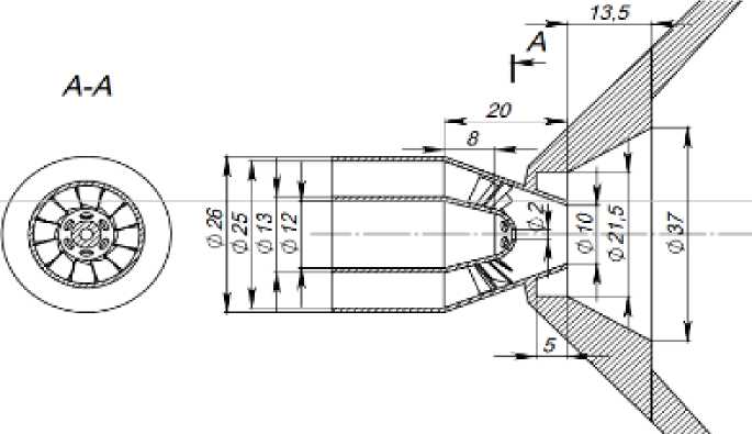 ния топлива. Также для более быстрого смешения топлива и окислителя на выходе из горелочного устройства был установлен диффузор с углом раскрытия меньшим, чем у диффузора камеры сгорания, на 10–15 градусов. Чертеж конструкции представлен на рис. 10.