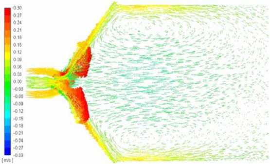 Рис. 9. Результаты моделирования в конструкции № 2: а – векторное поле скоростей; b – распределение температур