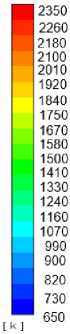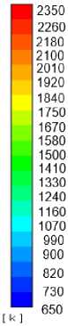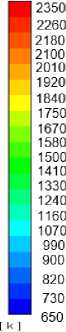 При увеличении массового содержания диоксида углерода при моделировании конструкции № 3 отрыв пламени не произошел. Предельным значением коэффициента γ для данной конструкции стало значение 0,87. При таких граничных условиях наблюдается снижение температуры горения с 2317 до 1897 К. Выбросы СО в данном случае составляют 339,6 ppm, а недожог – 2,442·10–8 ppmvd. Таким образом, при увеличении массовой доли диоксида углерода заметно снижается уровень выбросов СО (в 17,5 раза).
