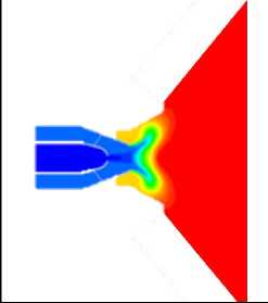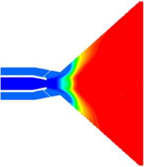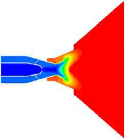 Известны исследования, проводимые зарубежными авторами [11, 12]. В качестве объекта рассматривается камера сгорания КТЭК с входным диаметром 83 мм и длиной 409 мм на экспериментальном стенде, предназначенная для работы при процентном массовом содержании кислорода в окислителе от 15 до 40 %. Использование CFD-моделирования при использовании методов RANS для учёта газодинамических процессов и кинетического механизма GRI-Mech 3.0 позволило численно получить распределения температур, скоростей потока и концентраций основных компонентов в момент зажигания смеси при давлении 1,0 МПа.