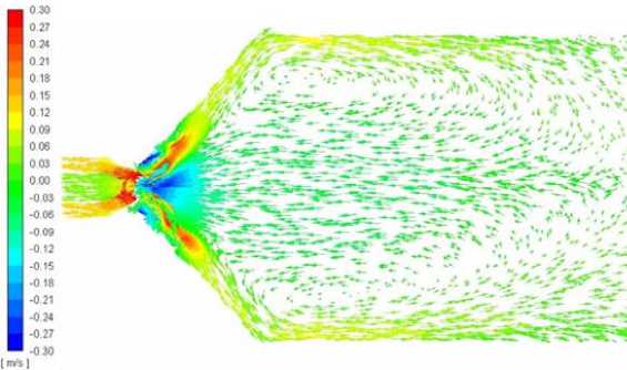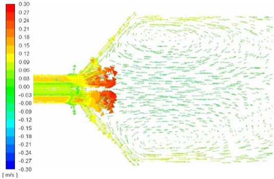 В результате проведения численного моделирования процессов горения в камере сгорания с горелочным устройством № 2 при тех же граничных условиях обнаружено, что, по сравнению с базовым вариантом, количество выбросов уменьшилось в 1,05 раза (см. табл. 1), это объясняется улучшением качества смешения компонентов горения, но при повышении значения коэффициента γ до 0,82 произошел отрыв пламени, так же как и в базовой конструкции. Результаты моделирования процессов в конструкции № 2 представлены на рис. 9.