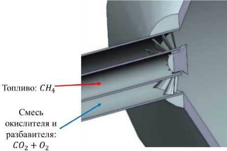 Природный газ подается по центральному каналу, а углекислый газ и кислород подаются совместно по кольцевому каналу. При использовании диоксида углерода для охлаждения было определено, что наибольшую эффективность показала щелевая система охлаждения, часто используемая в камерах сгорания авиационных газотурбинных двигателей. Горелочным устройством являлась диффузионная горелка с коническим плохообтекаемым телом по трубопроводу подачи топлива и с лопаточным завихрителем по трубопроводу подачи смеси окислителя и разбавителя.