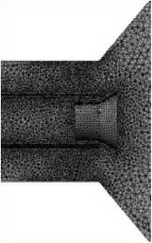 После построения трехмерной модели проточной части камеры сгорания, проводилось пространственное моделирование с использованием программного пакета ANSYS Workbench 18.2. Во встроенном модуле Mesh была создана расчетная сетка конечных элементов с уменьшением размера в области горелочного устройства. Разрез сеточной модели представлен на рис. 5.