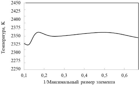 Было проведено исследование на сеточную сходимость. Получена зависимость значения максимальной температуры от значения, характеризующего точность сетки: число, обратное размеру максимального элемента сетки (риc. 6). Можно заметить, что при значении примерно от 0,25 и больше значение максимальной температуры изменяется всего на ±2–3 градуса, что составляет 0,12 % от самой величины. Такое колебание явля- ется незначительным и может возникать из-за погрешности численного метода моделирования. Исходя из данного графика можно сделать вывод, что все исследования проводились при достигнутой сеточной сходимости.