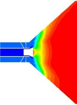 По результатам численного моделирования было обнаружено, что в базовой конструкции горелочного устройства предельным значением коэффициента γ является 0,82, при увеличении значения коэффициента происходит отрыв пламени. Также при устойчивом горении при γ = 0,804 наблюдается значительное количество выбросов, значение которых приведены в табл. 1. Помимо этого, на плохообтекаемом теле существует локальный максимум температур, что говорит о том, что данная конструкция горелки не может обеспечивать надежную работу всей камеры сгорания, векторное поле и распределение температур приведены на рис. 7.