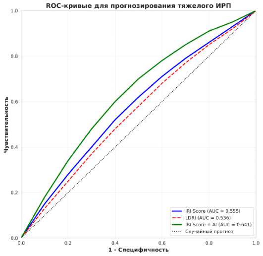 Рисунок 1. ROC-кривые прогнозирования развития тяжёлого ИРП у пациентов