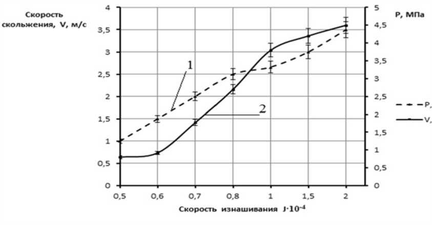 С целью изучения влияния параметров PV на триботехнические характеристики разработанного нанокомпозиционного материала было проведено исследование, приближенное к условиям реальной эксплуатации: P = 0,5 ÷ 4,5 МПа, V = 0,8 ÷ 3,5 м/с. Полученные данные представлены на рис. 2.