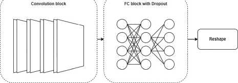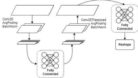 Следуя за работой [11], рассмотрим архитектуру иного вида (третью предлагаемую здесь сеть). Пусть нейронная сеть имеет сверточные кодер и декодер, между которыми находится полносвязная сеть из трех слоев, а также после прохождения декодера данные пропускаются через двуслойную полносвязную сеть и преобразуются в необходимый формат (матрица N×N ). В чистом виде данная сеть из [11] неприменима к решению поставленной задачи. Главное отличие модифицированной модели от базовой состоит в добавлении слоев обратной свертки в качестве декодера, изменении параметров последнего полносвязного слоя и добавлении Reshape-слоя для приведения выходных данных к требуемому формату (рис. 4).