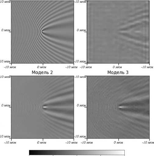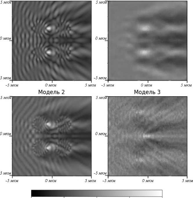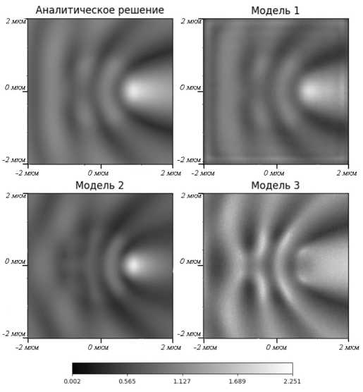 Так, качественно лучшим образом смогла аппроксимировать функцию распределения интенсивности электрического поля первая модель. При этом данная модель успешно смоделировала паттерн, незначительно отклоняясь от истинных значений (ошибка составила 6,4%). При этом отметим недостатки остальных моделей. Так, вторая модель демонстрирует паттерн, схожий с истинным, однако отличный от него количеством минимумов и максимумов как внутри цилиндра, так и вне его (ошибка для примера на рис. 5 составила 22,96%). Третья же модель не справилась с поставленной задачей (ошибка для примера на рис. 5 составила 55,9%).