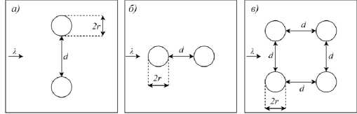 Теперь рассмотрим случай, когда дифракция происходит не на одном цилиндре, а на их наборе. В дальнейшем планируется расширить данный случай на исследование распространения излучения в фотонно-кристаллических структурах. В известных авторам работах решение данной задачи с использованием нейронных сетей ранее не рассматривалось. В этом случае рассмотрим следующие три конфигурации: два цилиндра, расположенных вертикально, два цилиндра, расположенных горизонтально, и четыре цилиндра, центры которых расположены в вершинах квадрата (рис. 7). При этом под вертикальным расположением будем понимать такое, что на оба цилиндра падает неискаженная волна, а прямая, соединяющая центры сечений, параллельна фронту падающей волны. Под горизонтальным расположением будем подразумевать такое, что неискаженная волна падает только на один цилиндр, а прямая, соединяющая центры сечений, перпендикулярна фронту падающей волны.